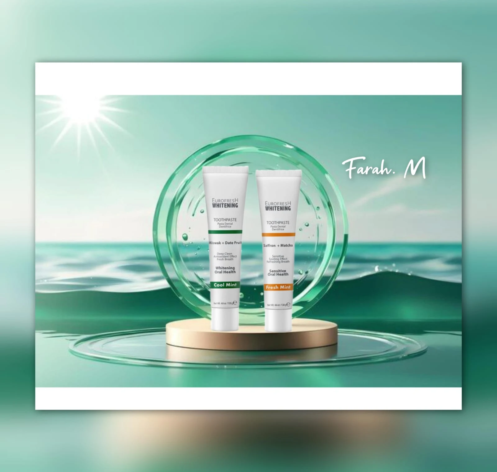 _عبوات من معجون أسنان يوروفريش المبيض (Eurofresh Whitening Toothpaste). 🤍✨ _يوجد نكهتان معروضتان:المسواك والتمر، والزعفران والماتشا. _تم تصميم معجون المسواك والتمر للتبييض والصحة العامة للفم. _تم تصميم معجون الزعفران والماتشا لصحة الفم الحساسة. كلا المنتجين يوفران تأثير النعناع المنعش🤍✨. |
