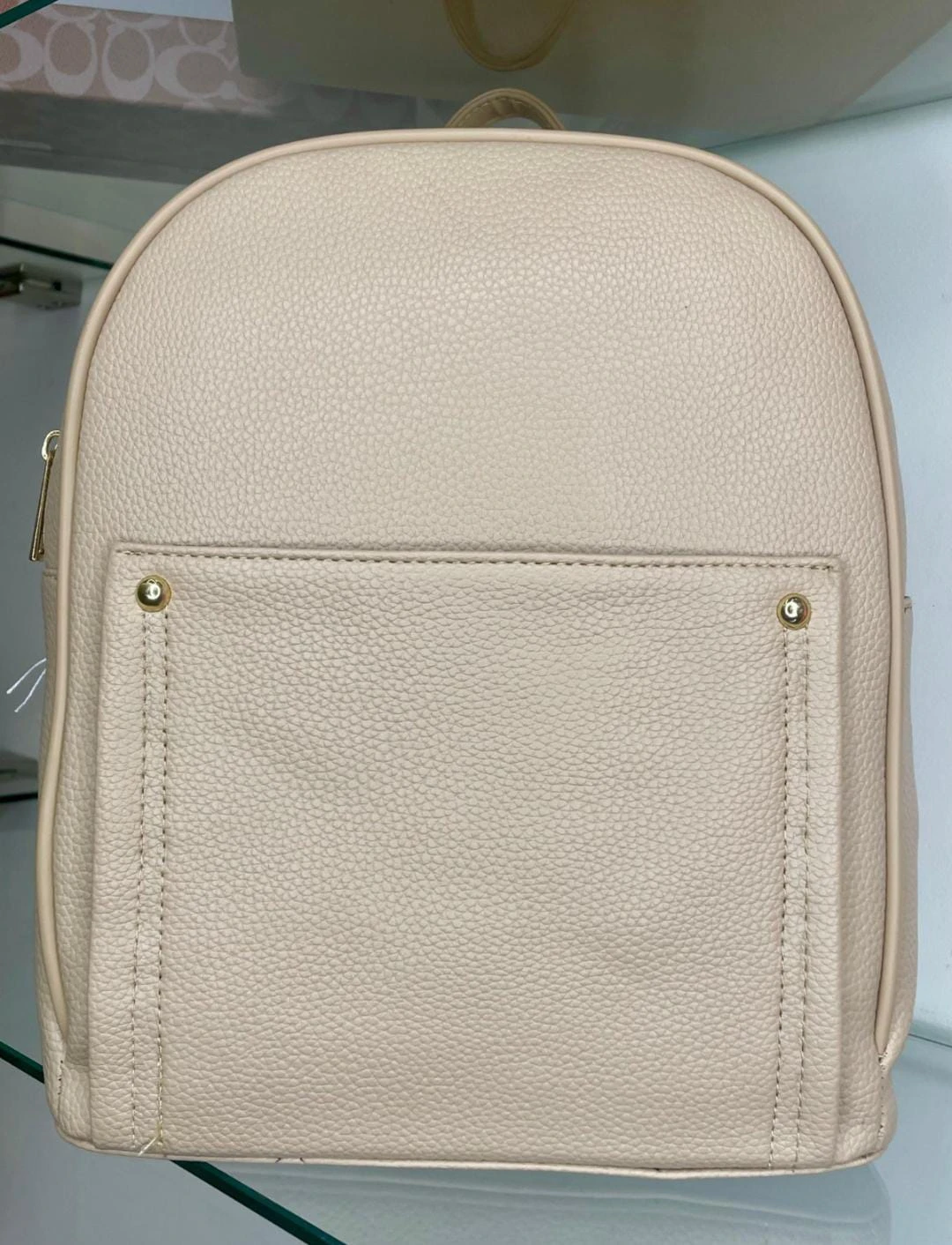 Medium-sized beige backpack with a modern, elegant design, ideal for everyday use. Lightweight and practical, offering enough space to organize essentials while complementing different outfits with a clean and refined look. |