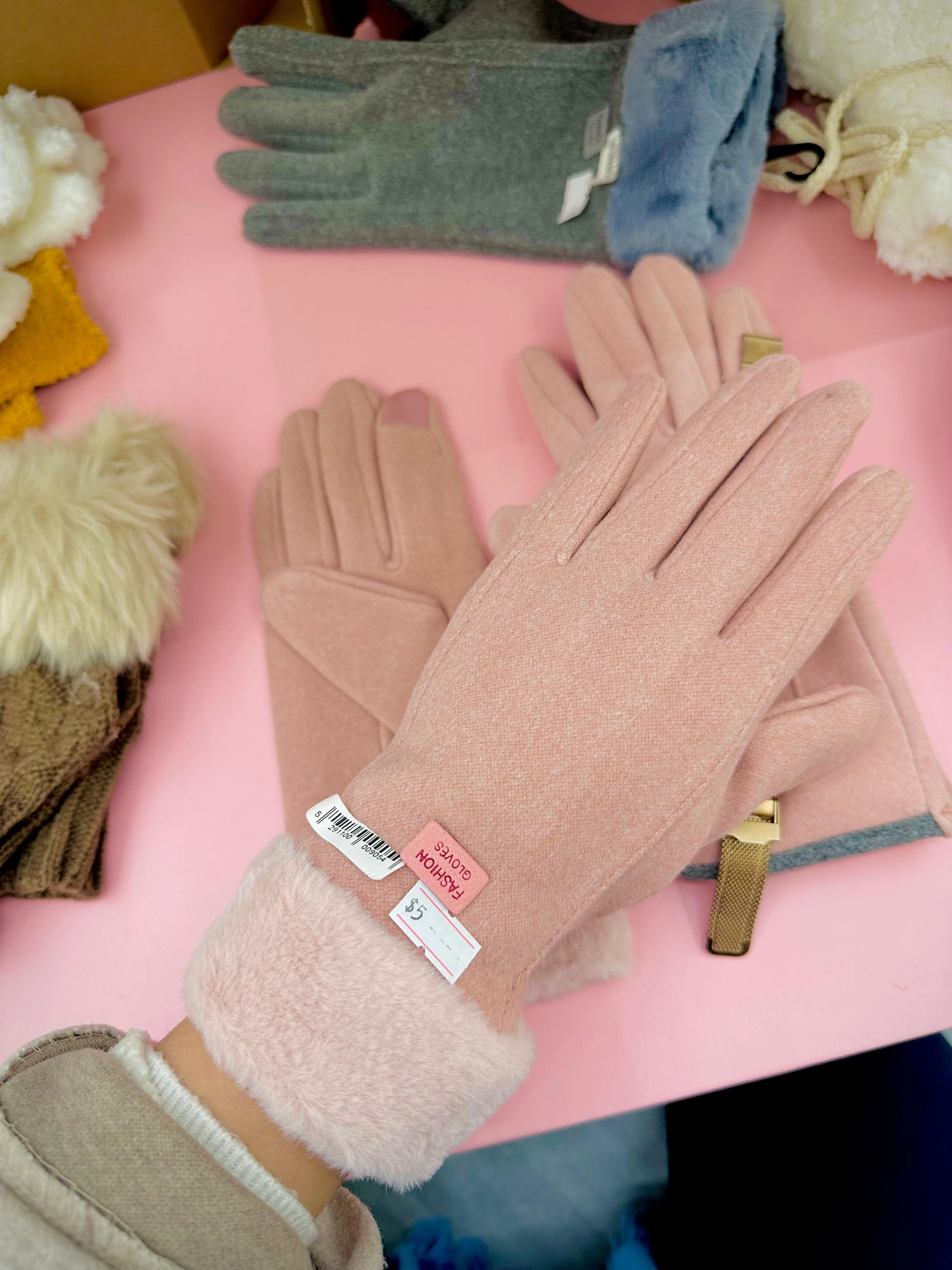pink winter gloves lined with warm fleece, finished with a soft blue plush cuff. Designed to provide cozy warmth and comfort while adding a stylish touch to everyday winter looks. |