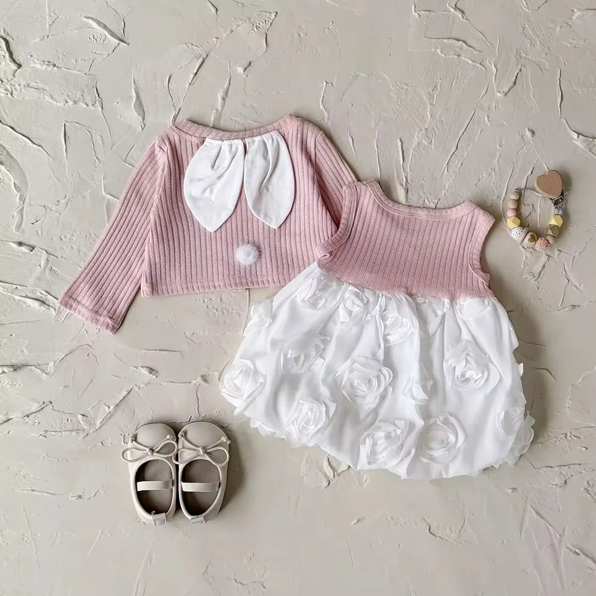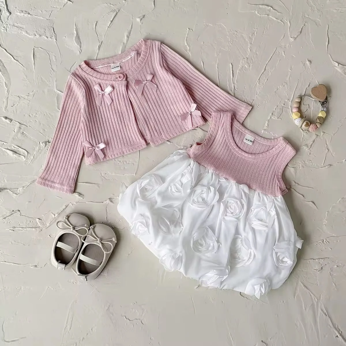 مجموعة أميرة بوردة بيضاء حلوة + كارديجان بأكمام طويلة ، للفتيات الصغيرات، للربيع/الخريف من 3 اشهر للسنة ونص |