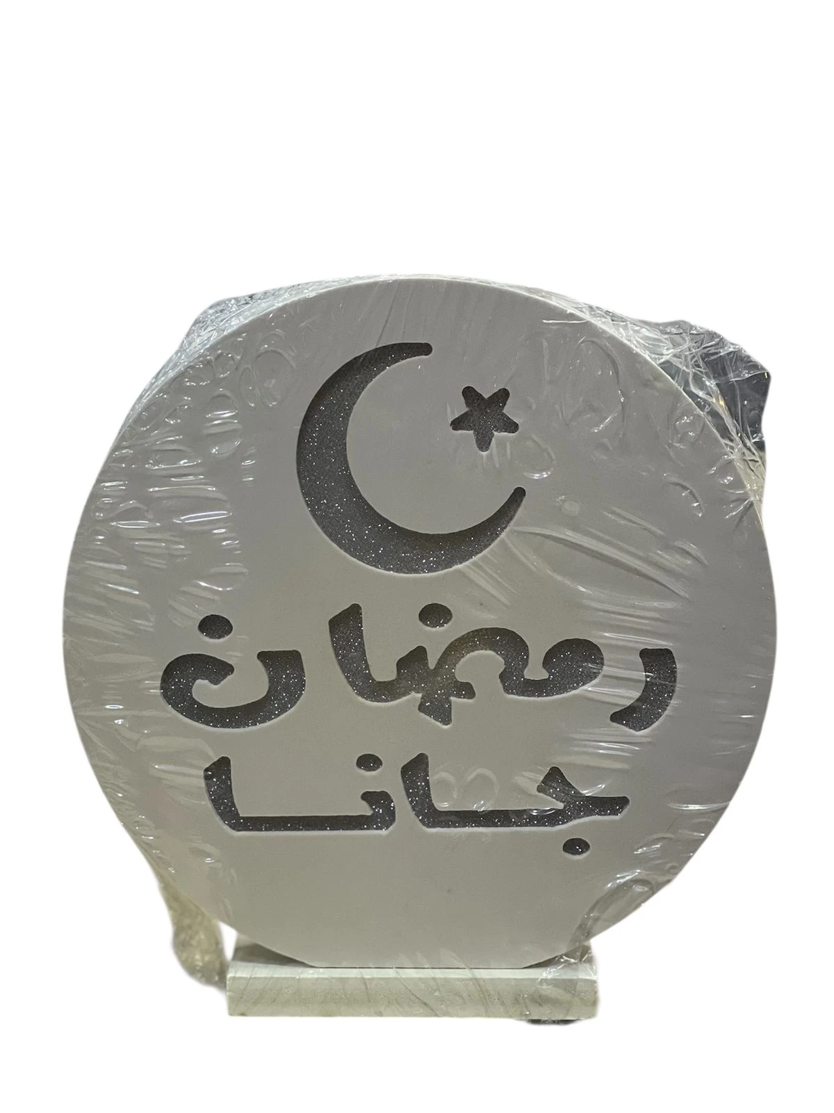 فانوس و ديكور رمضاني على شكل هلال يضيء، يحمل عبارة (رمضان جانا) مصنوع من خشب |