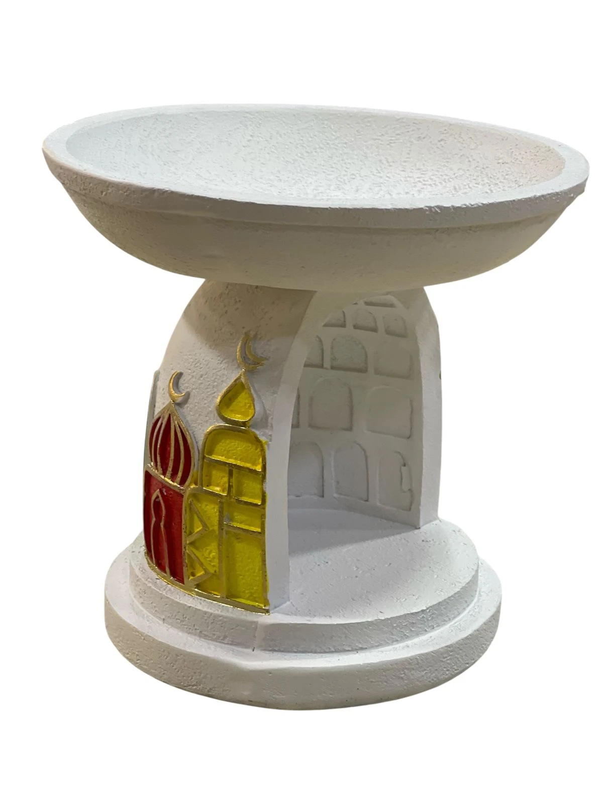 شمعدانات أو أطباق تقديم صغيرة بتصميم رمضاني مزخرف بأشكال مساجد ملونة تتميز بتصميم عمودي بقاعدة ثابتة وسطح علوي مسطح الزخارف مستوحاة من العمارة الإسلامية وتأتي بألوان زاهية مصنوعة من الجفصين الطول: ١٥ سم |
