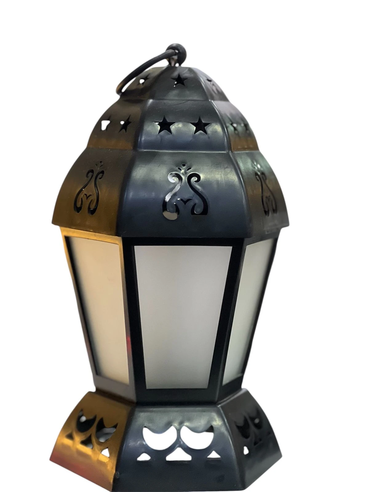 فانوس رمضان مضيء بزخارف النجوم والهلال، قاعدته سداسية وزجاجه شفاف، يعمل بالبطاريات ويعلق بسهولة أو يوضع ك منظر دافئ |