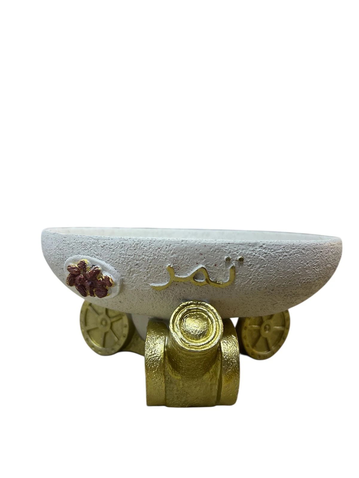 طبق أبيض بيضاوي الشكل تمرية محمول على قاعدة ذهبية مزخرفة تتميز بتصميم يشبه المدفع بعجلات مزخرفة لتقديم التمر مصنوع من الجفصين عرض: ٢٣ سم |