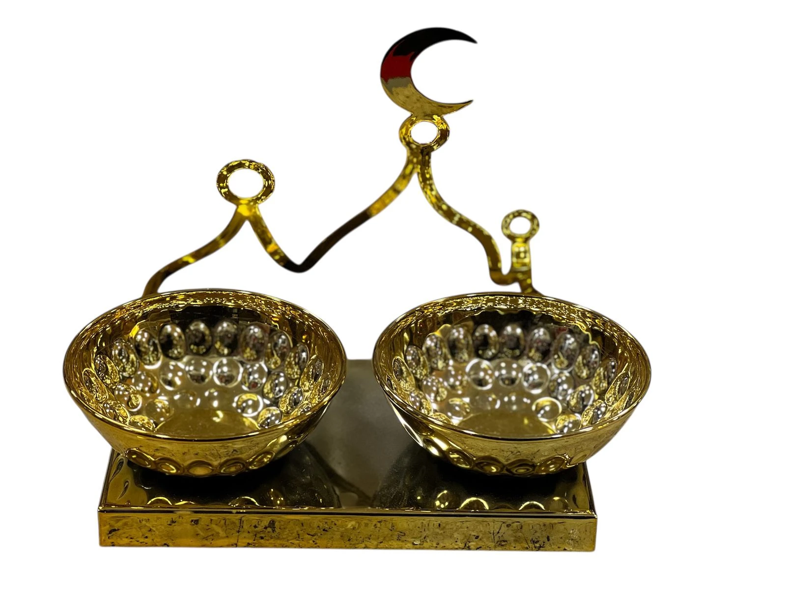 وعاء تقديم ذهبي من المعدن بفتحة على شكل هلال ونقوش إسلامية عرض ٢٠سم، مصنوع من ستانلس ستيل آمن للطعام. مثالي لتقديم التمر والمكسرات والحلويات بطريقة أنيقة. |