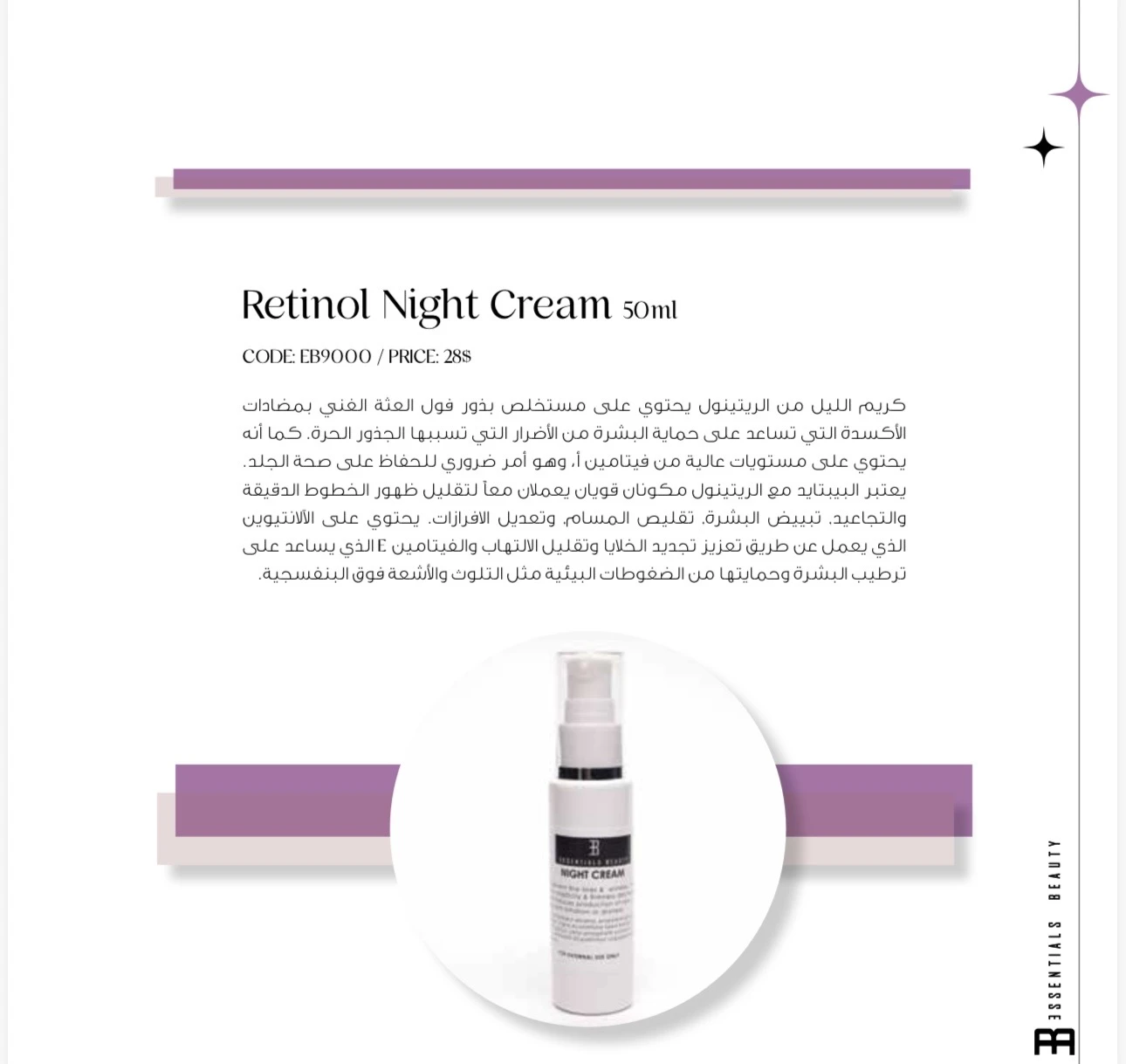 Retinol Night Cream 50ml كريم الليل من الريتينول يحتوي على مستخلص بذور فول العثة الغني بمضادات الأكسدة التي تساعد على حماية البشرة من الأضرار التي تسببها الجذور الحرة. كما أنه يحتوي على مستويات عالية من فيتامين أ، وهو أمر ضروري للحفاظ على صحة الجلد. يعتبر البيبتايد مع الريتينول مكونان قويان يعملان معا لتقليل ظهور الخطوط الدقيقة والتجاعيد. تبييض البشرة. تقليص المسام. وتعديل الافرازات. يحتوي على الآلانتيوين الذي يعمل عن طريق تعزيز تجديد الخلايا وتقليل الالتهاب والفيتامين E الذي يساعد على ترطيب البشرة وحمايتها من الضغوطات البيئية مثل التلوث والأشعة فوق البنفسجية. NIGHT CREAM |