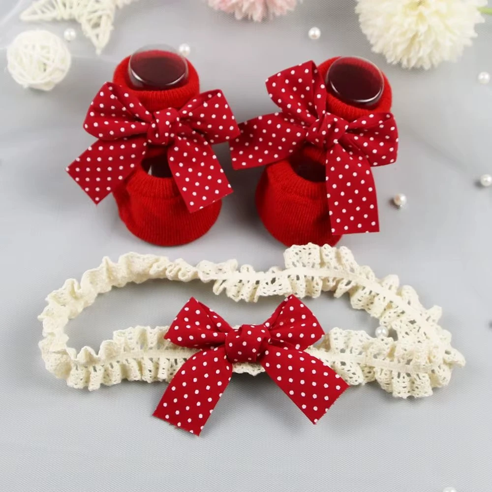 Bow Socks Baby Christmas Gift Cotton Socks Headband Set Infant Anti Slip Socks Toddler Floor Socks Newborn Baby Girl Socks