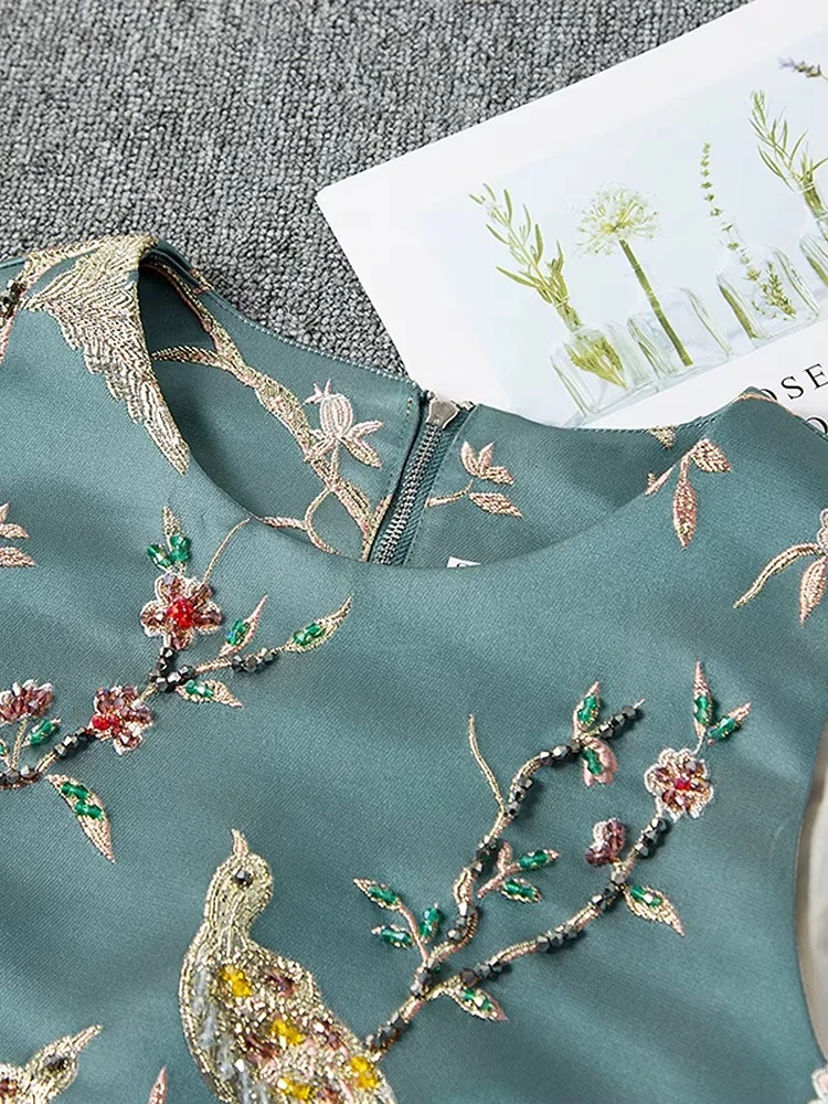 Luxury Beaded Cheongsam Dress for Women Autumn Mist Blue High-End Rhinestone Embellished Sleeveless Qipao-Inspired Elegant Dress