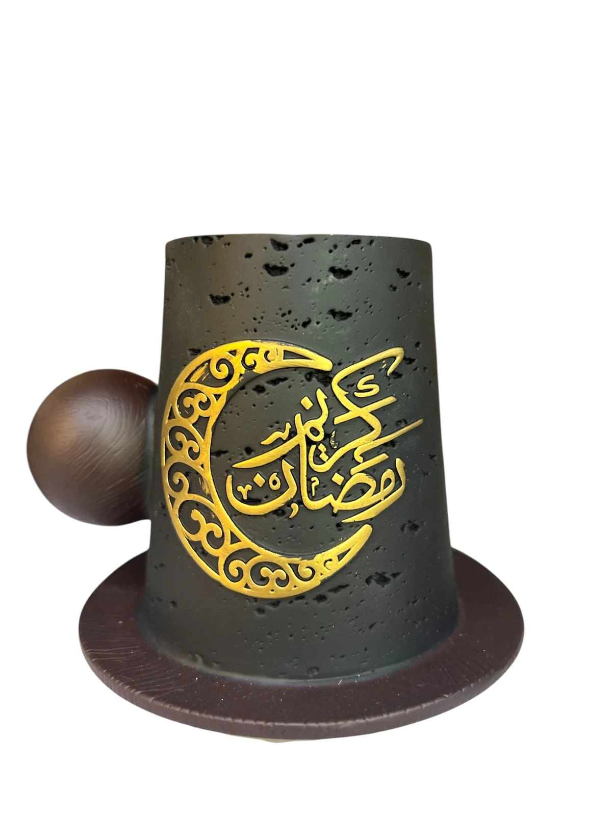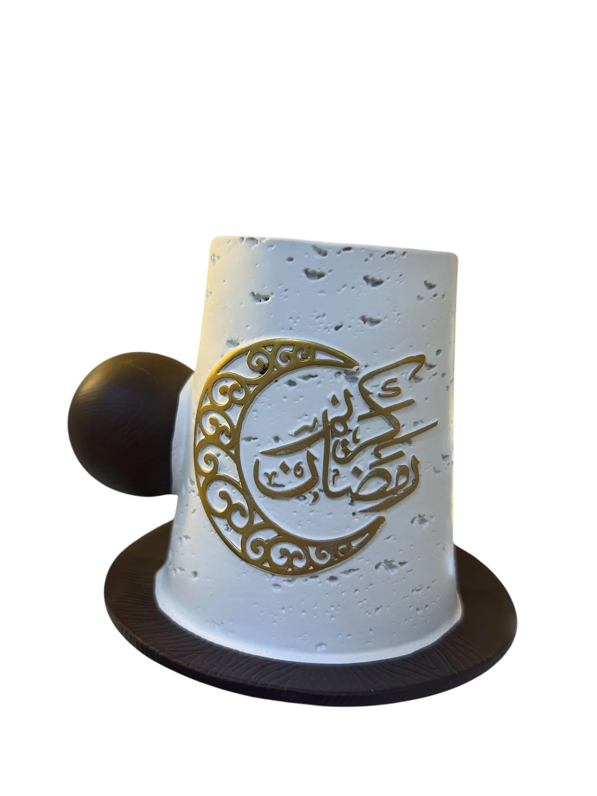 قطعة ديكور أنيقة لشهر رمضان 🌙، تجمع بين شكل الكوب والمبخرة، بتصميم هلال وغطاء على طراز الطربوش، مزينة بعبارة رمضان كريم بخط عربي جميل. تُستخدم للزينة في رمضان والعيد أو كهدية مميزة، وتتوافر بتصاميم وخامات متعددة باللونين الأسود و الأبيض |